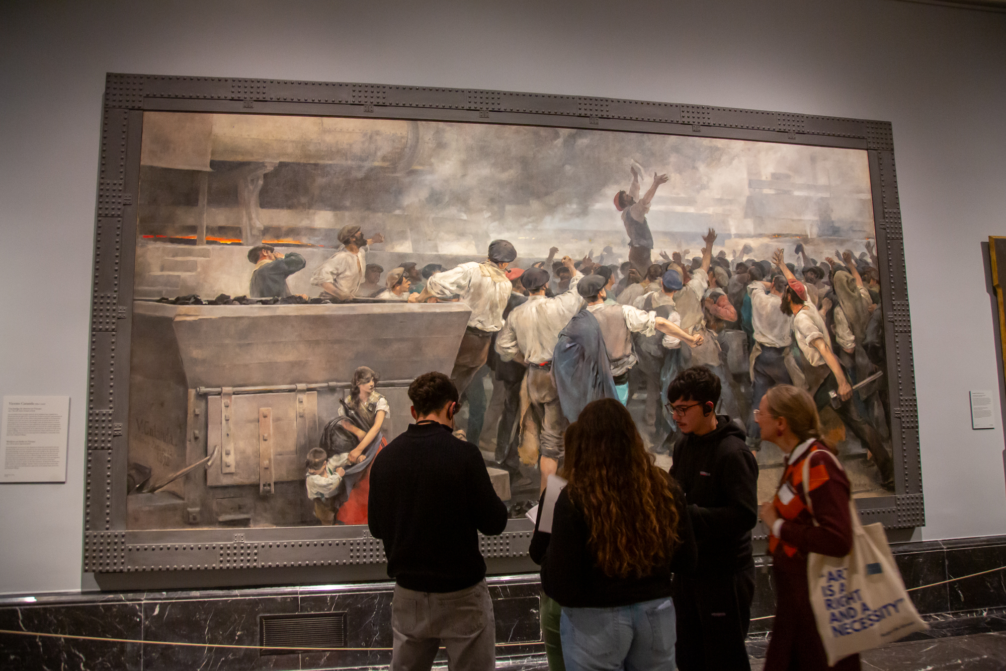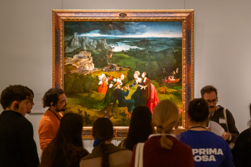 Jose Iglesias Garcia Arenal trabajó a partir de la propuesta Mi cuerpo, otros territorios, con obras donde se abordan la relación entre el territorio y los cuerpos humanos que lo habitan. Las obras escogidas han sido: Las Tentaciones de San Antonio Abad de Joachim Patinir y Quiten Massys (1520-1524) y Una huelga de obreros en Vizcaya de Vicente Cutanda (1892). En la primera hemos visto cómo la construcción del paisaje afecta a lo narrado en la escena principal del cuadro, evidenciando la relación histórica entre género y naturaleza. En la segunda obra, los obreros en huelga en un tiempo pasado y convulso como fue la intensa industrialización de Bilbao y la defensa de los derechos laborales a finales del siglo XIX, también interpela cómo ocupamos los espacios actualmente con nuestras reivindicaciones. En la visita redescubrimos también las obras que acompañan a las piezas pictóricas seleccionadas en las salas y las posibilidades de interpretación junto a los y las estudiantes haciendo de la visita un juego y una investigación.
